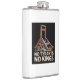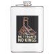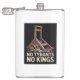 This bold, graphic design features a stark illustration of a wooden guillotine set against a black background. At the base of the structure, two ornate crowns—one large and elaborate, the other smaller—lie discarded and broken amidst scattered rubble and gold coins. Below the imagery, the defiant, distressed-style text reads: "NO TYRANTS NO KINGS."