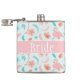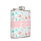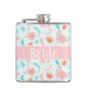 Con un bonito fondo azul con flamencos rosas, también hay flores y plumas rosas y azules que decoran este diseño. En el medio, la "Novia" está escrita en un fondo rosado. ¡Compra tu matraz de novia hoy! Material gráfico de fondo creado por: AMBilustrations http://www.etsy.com/shop/AMBillustrations/
