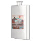 Paisaje montañoso en rojos y azules con un lago y un arcoíris azul audaz.