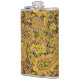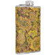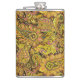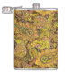 A complex paisley pattern in warm yellow tones features intricate floral and leaf motifs, characterized by delicate lines and ornate details. The design exhibits a harmonious balance of color and elaborate shapes that create a captivating visual effect.