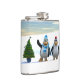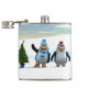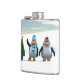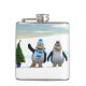 Dos lindos pingüinos personalizados felizmente parados frente a un árbol de Navidad en la nieve. El niño lleva una gorra de caldo y una bufanda y la chica tiene un arco rojo en la cabeza.