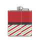 Un matraz personalizado con la mitad inferior cubierta en un patrón rayado en diagonal verde y blanco. Remínseco de latas de dulces de Navidades con sabor a menta. La mitad superior del diseño es un rojo festivo. En el centro se encuentra un círculo lindo en un estilo caprichoso, con un monograma personalizado y un nombre en el centro.