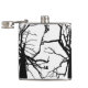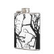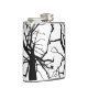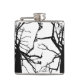 Este matraz de cadera presenta un patrón artístico, abstracto en blanco y negro de la parte superior de un tulipán en invierno con ramas desnudas en silueta.
