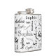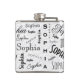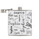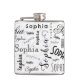 Un matraz de nombre personalizado para la bebida favorita de Sophia. El guión inicial "S" hace un patrón decorativo en el fondo. Su nombre presenta una mezcla de letras divertidas y llamativos colores contrastantes de negro, blanco y gris. Este personalizado hace una gran elección de regalo para cualquier ocasión que requiera un buen espíritu.