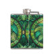 Two metal flasks with vibrant green tropical leaf designs over a geometric pattern. The tone is lush and lively, evoking a sense of nature.