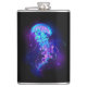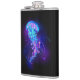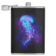 Gran medusa azul, de dibujo artístico, brillante y brillante, con largos tentáculos sobre fondo negro con bioluminiscencia violeta. Luminosas medusas.