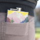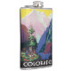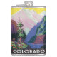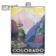 Escena de Colorado de un antiguo poster de viajes con "Colorado" en el fondo en una fuente deco. La colorida imagen muestra montañas, arroyos, pinos, y un hombre y una mujer vestidos con ropa occidental.