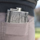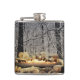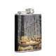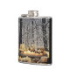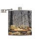 Este matraz presenta una escena estacional del Solsticio de Invierno de un León Yule en llamas en un antiguo bosque de trébol de nieve.
