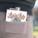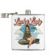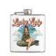 This vintage-style "Lucky Lady" flask features a gorgeous, smiling girl dressed in a bomber jacket, sitting provocatively on an aerial bomb. The vintage, comic-book style with its distressed look and bold script is reminiscent of classic bomber nose art seen on aircraft like the B-17 Flying Fortress.