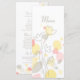 Menús de boda o de cena formal modernos confeti pétalos de flores. Menú de cena doble cara simple arte de línea moderna flor con estilo de confeti de pétalos amarillo, naranja y gris. Dibujado y diseñado de forma única por Sarah Trett para www.mylittleedenweddings.com
