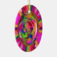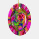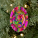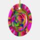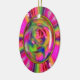 El diseño es una combinación de fotografía y arte digital. Comenzó la vida como una bella rosa rosa rosa rosa pastel del jardín. Retrabajé la imagen digitalmente para crear un arcoiris de colores dulces girados por todos lados. Finalmente, coroné el rosa central con vidrio digital y un delgado marco oval de oro. Está lleno de colores vivos y audaces. El diseño está a ambos lados del adorno. Prueba este adorno para los Navidades o incluso como decoración de espejo retrovisor.