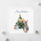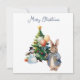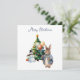 Peter el Conejo con globos y un árbol de Navidad y muñeco de nieve Feliz Navidad y Feliz Año Nuevo