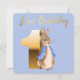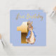 Pedro el Conejo con el texto de "Primer cumpleaños" de oro con el número uno de oro. De vuelta: deseándoles un feliz Primer Cumpleaños