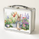 Pedro el conejo en su chaqueta azul con globos de colores en su jardín florido con una valla de piquete blanco