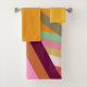 El conjunto de toallas incluye un lavabo amarillo, una toalla de oro y una toalla de baño con un diseño retro de los años 70, con una capa vertical de Vs en tres lugares, todo de colores retro.