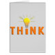 Un diseño simple que dice "piensa" con una bombilla que puntea la letra "yo" en amarillo y naranja. Hay líneas onduladas alrededor del bulbo que podría representar discutible el pelo desalinado de Albert Einstein.