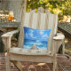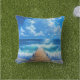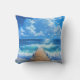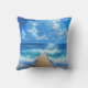 almohada de tiro al aire libre con la imagen de un muelle oceánico con agua azul y nubes blancas.