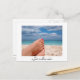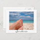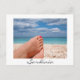 Postal de los pies de las mujeres con esmalte de uñas rojo rosado en una playa blanca en la isla de Cerdeña en el mar mediterráneo relajándose durante las vacaciones de verano con un borde blanco y el texto: 'Cerdeña'.