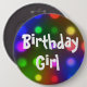 Un perno colorido festivo del botón con un bokeh del fondo de las luces coloreadas del fiesta y del texto dice: "Chica del cumpleaños". O cambíelo al "muchacho". Fácil modificar esta insignia para requisitos particulares linda y personalizarla con cualquier edad o nombre, etc. ¡Un perno feliz y de la diversión del botón para los niños y todas las edades!