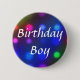 Un perno colorido festivo del botón con un bokeh del fondo de las luces coloreadas y de las palabras "muchacho del fiesta del cumpleaños". Fácil modificar para requisitos particulares para personalizar. ¡Un perno feliz y de la diversión del botón para los niños y todas las edades!