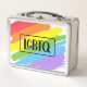 Esta obra de arte presenta un arcoiris colorido con las letras LGBTQ.