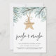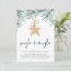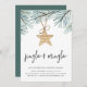Invite a amigos y seres queridos a compartir su alegría en esta temporada navideña con nuestras modernas y festivas invitaciones para fiestas. Moda de diseño sencillo con ramos de pino acuático de verde fresco, adornado con un único adorno de una estrella de madera. "Jingle y Mingle" aparece debajo de la letra manuscrita. Personalice los detalles de su fiesta de vacaciones utilizando las cuatro líneas de texto personalizado proporcionadas.