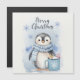 Una encantadora ilustración invernal de un pequeño pingüino adorable que lleva un sombrero y una bufanda a rayas azules, que aporta un ambiente acogedor y festivo. Los copos de nieve suaves y los tonos azules suaves en el fondo crean una atmósfera mágica de invierno. ¡Perfecto para tarjetas de Navidad, carteles, pegatinas y manualidades de temporada!