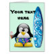 Traje de baño que lleva del pingüino lindo y llevar a cabo un helado y a un tablero que practica surf azul con el estampado de plores.