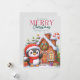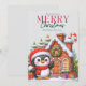 Esta adorable tarjeta de Navidad presenta a un pequeño pingüino encantador envuelto en una bufanda roja acogedora y un sombrero diminuto de Santa. El pingüino está de pie alegremente frente a una casa de pan de jengibre, rodeado de árboles y decoraciones de Navidad. El interior de la tarjeta queda en blanco para tu mensaje, lo que la hace perfecta para difundir alegría navideña a amigos y familiares. Con su diseño conmovedor y espíritu juguetón, esta tarjeta seguramente traerá sonrisas y calidez a la temporada navideña de cualquiera.