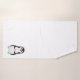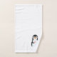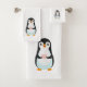 Pingüino lindo sosteniendo un corazón sobre un juego de toallas blancas. Ideal para todos.
