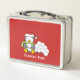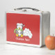 Un pequeño personalizado de pingüino con sombrero de santa y pañuelo verde sentado y sosteniendo una bola de nieve.