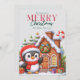 Esta adorable tarjeta de vacaciones para Navidades incluye un pequeño pingüino lleno de encanto, con una acogedora bufanda roja y un pequeño sombrero Santa. El pingüino se alza alegremente frente a una casa de jengibre, rodeada de árboles y decoraciones navideños. El interior de la tarjeta se deja en blanco para tu mensaje, lo que hace que sea perfecto para extender la alegría de las vacaciones a amigos y familiares. Con su diseño reconfortante y su espíritu lúdico, esta carta le dará a todo el mundo sonrisas y calidez en sus vacaciones.