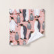 Pingüinos emperadores y sus cachorros sobre un fondo con motivos rosas. Patrón antártico decorativo.