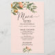 Menú de Baby Shower "Pink Clementine Little Cutie" chica temático "Citrus" con un fondo rosa. Este diseño presenta dos diseños de cítricos, florales y follaje y una imagen de cabecera de letra caligráfica que se puede eliminar.