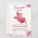 Un hada delicada, adornada en tonos rosas y rodeada de flores, adorna la fachada de la invitación y extiende sus alas en un gesto de alegría y admiración. Detrás de ella, un jardín florece con vibrantes tonos rosados y morados, creando una escena que sale directamente de un cuento de hadas.