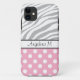 funda personalizado para iPhone 5 personalizado con su nombre, y diseñado con un patrón de puntos polka rosa y blanco y un patrón de impresión de cebra descolorida con rayas de cebra grises y blancas.