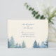 Esta tarjeta RSVP presenta un elegante diseño acuático de árboles de color verde perenne en tonos azules y verdes, con un suave fondo crema. El texto, con las opciones de "aceptar alegremente" o "lamentablemente declinar", es sencillo pero refinado, haciendo de esta carta ideal para bodas, eventos especiales o reuniones formales que adoptan un tema de inspiración natural o rústico. La tranquila escena del bosque evoca una sensación de calma y conexión con la naturaleza, perfecta para eventos al aire libre o en el bosque.