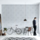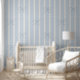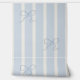 Papel de paredes de rayas verticales de color azul y lino suaves con arcos dibujados a mano azul polvoriento.