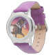 Fotografía de un caballo de pintado galopando durante un colorido amanecer, mostrada en un reloj.