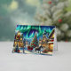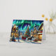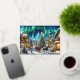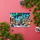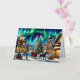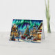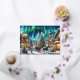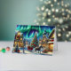 Se despliega una pintoresca escena de las maravillas del invierno, con un encantador pueblo cubierto de nieve bañado por el resplandor etéreo de la aurora boreal. Un majestuoso árbol de Navidad, adornado con luces brillantes y adornos coloridos, se alza orgullosamente en el centro de la plaza del pueblo. Un trineo tirado por caballos, reluciente de alegría festiva, espera pacientemente a sus pasajeros, mientras un muñeco de nieve, hecho con amor, se mantiene vigilante cerca. Los edificios están muy bien decorados con guirnaldas, coronas y luces que brillan, lo que crea un ambiente cálido y acogedor. Los tejados cubiertos de nieve y la suave nieve que cae añaden un ambiente mágico, lo que hace que este sea un escenario de invierno verdaderamente encantador.
