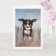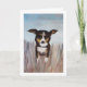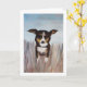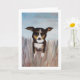 Un perro amigable jugando en la hierba alta es una excelente manera de decir hola. Transfiere fácilmente esta pintura acrílica a otras tarjetas y regalos. Los colores azul, beige, marrón y caramelo son hermosos como tarjeta de agradecimiento, tarjeta de cumpleaños o simplemente para tu papelería personal.