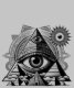 Muestra una obra de arte digital con una representación gráfica de una pirámide dentro de un ojo, rodeada de estructuras piramidales adicionales que crean un paisaje surrealista envuelto en una mezcla de tonos negros y blancos, que recuerdan a las sombras y a la luz jugando a través de un ambiente de ensueño. Las colinas ondulantes se desprenden suavemente bajo un cielo estrellado, iluminado por detalles resplandecientes y contrastantes que evocan una sensación de movimiento e inexplicabilidad.