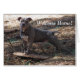 Esta tarjeta dice: "Bienvenido a casa". En su interior dice: "Ahora, ¡JUGEMOS!" Una adorable tarjeta que muestra un hermoso Pitbull de la Nariz Azul llamado Sarge. Sarge está de pie con sus dos patas delanteras en su juguete favorito, un patinador. Sus patas traseras están extendidas y sus orejas están altas y alerta, mientras este hermoso perro te mira en una posición perfecta.