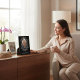 Honre la memoria de un ser querido con esta elegante placa de foto conmemorativa. Con un diseño atemporal de corona floral plateada sobre un fondo negro sofisticado, esta placa enmarca hermosamente una fotografía preciada. El texto 'En memoria amorosa', junto con el nombre y las fechas, se muestra elegantemente debajo de la foto, creando un tributo conmovedor. Esta placa sirve como un hermoso recuerdo, perfecto para exhibir en el hogar o en un servicio conmemorativo, manteniendo vivo su espíritu a través de recuerdos preciados. Deje que esta exquisita pieza sea un recordatorio constante de una vida bien vivida y profundamente apreciada.