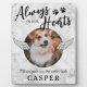 Elegante placa conmemorativa para mascotas con fondo de mármol falso, el título 'por siempre en nuestros corazones', huellas de patas, una foto de tu querida mascota perro o gato, alas de ángel, su nombre y la frase de condolencias 'te veré al otro lado'.