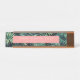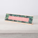 El nombre de la placa de la mesa de moda tropical incluye dos líneas de texto personalizado para su nombre y título o nombre comercial. Personalice sus detalles con letras blancas modernas en un rectángulo rosa de coral sobre un fondo dramático de hojas botánicas de selva y follaje.