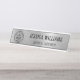 Adorn your desk with this elegant sign design, showcasing a sophisticated faux brushed silver metallic finish that instantly conveys prestige. The layout features a prominent space for your custom logo on the left, perfectly complementing the clear, modern typography used for the name and title. Encased in sleek, dark framing, this design offers a refined and professional aesthetic, creating an impressive focal point for any workspace.