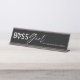 Personalice y decore su espacio de trabajo y hágalo saber quién es con nuestra divertida, elegante y moderna placa de personalizado "Jefe Chica". El diseño presenta un fondo negro con "Boss Chica" diseñado en un estilo moderno de escritura de pincel blanco y tipografía serif san con un corazón elegante reemplazando la letra "o" y personalizada con su "también conocido como"... su nombre.