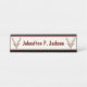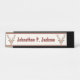 Este escritorio o placa con nombre colgante es blanco con dos cabezas de ciervo marrón macho con grandes antorchas con un borde rojo profundo en la parte superior e inferior. Personalizar tu nombre con la plantilla.