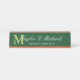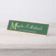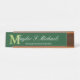 Add a personal touch to your office desk with this elegant nameplate with your initial in lime green against a dark green background under your name and title in white.
